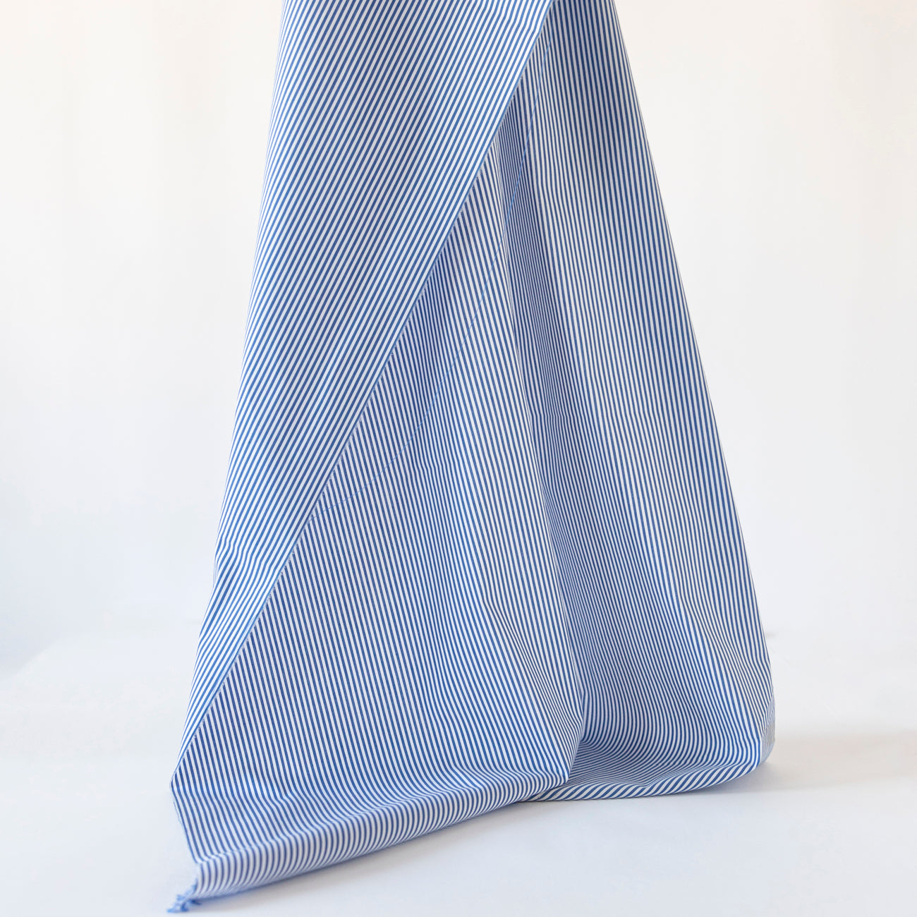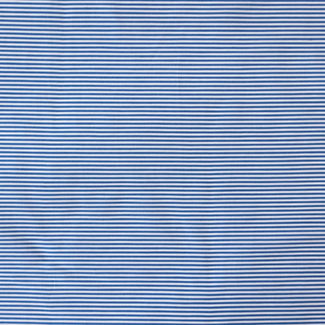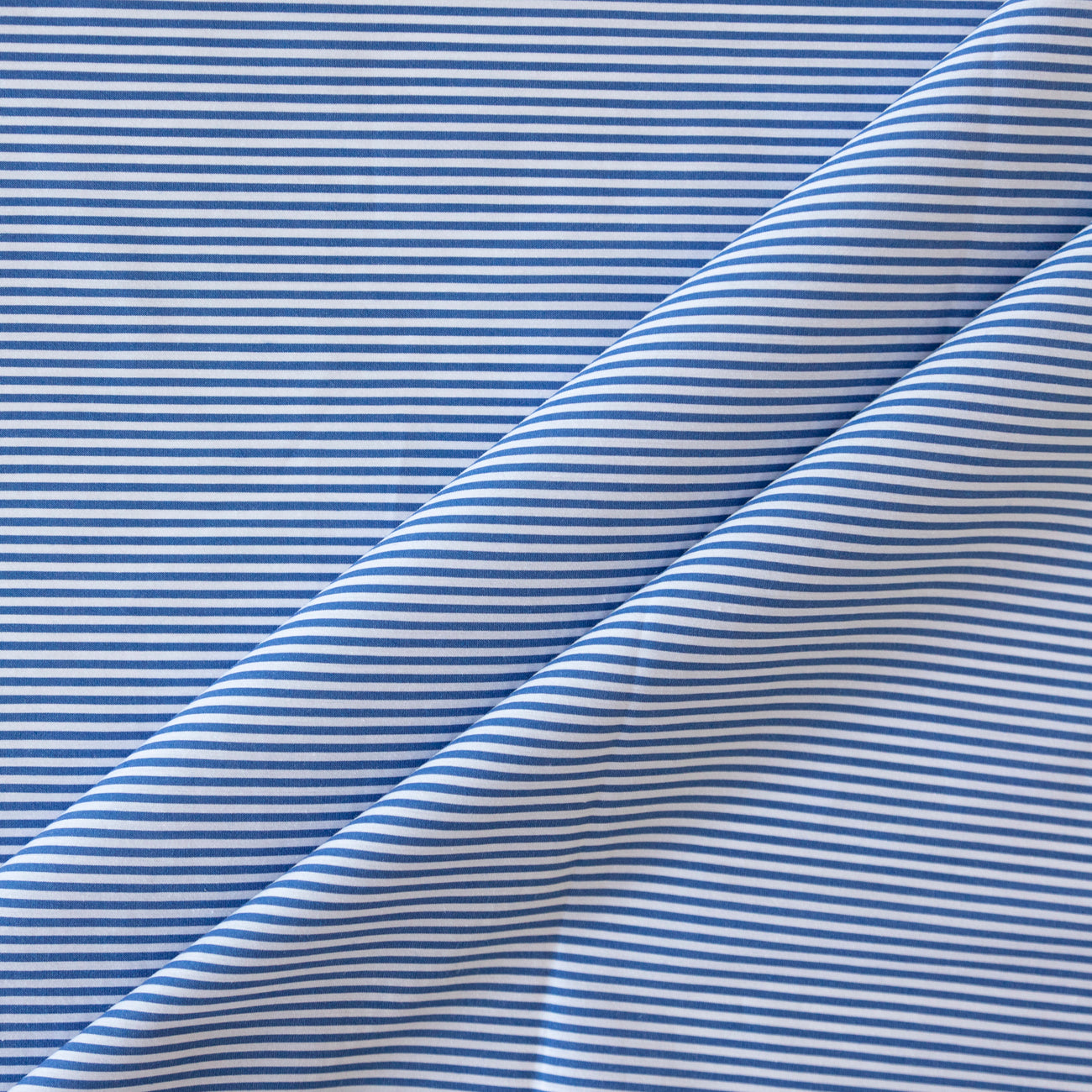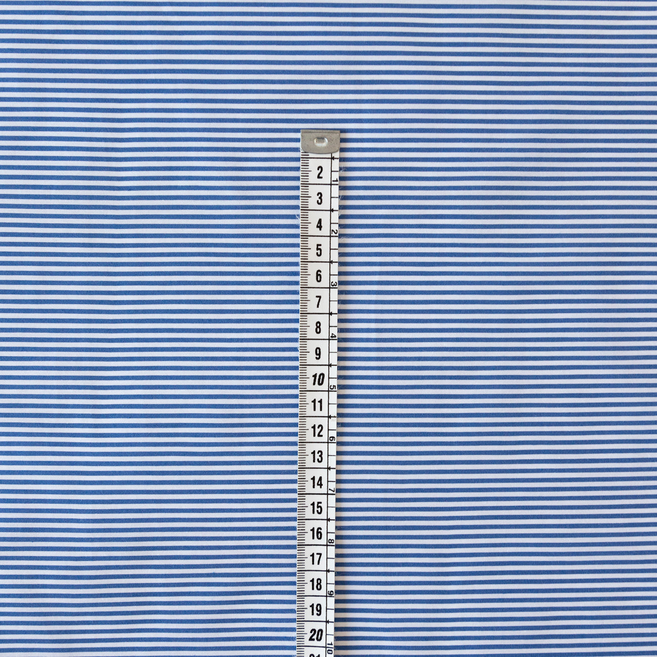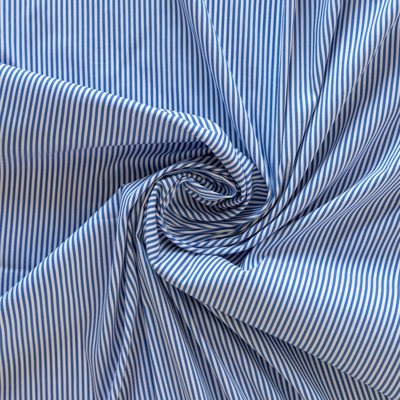 Bumbac alb cu dungi albastre – material elastic, plăcut la atingere și ușor de întreținut. Compoziția din amestec de bumbac și fibre sintetice îi oferă rezistență, durabilitate și o cădere frumoasă. Țesătura este moale, lasă pielea să respire și absoarbe umezeala, păstrând totodată confortul termic în orice sezon.