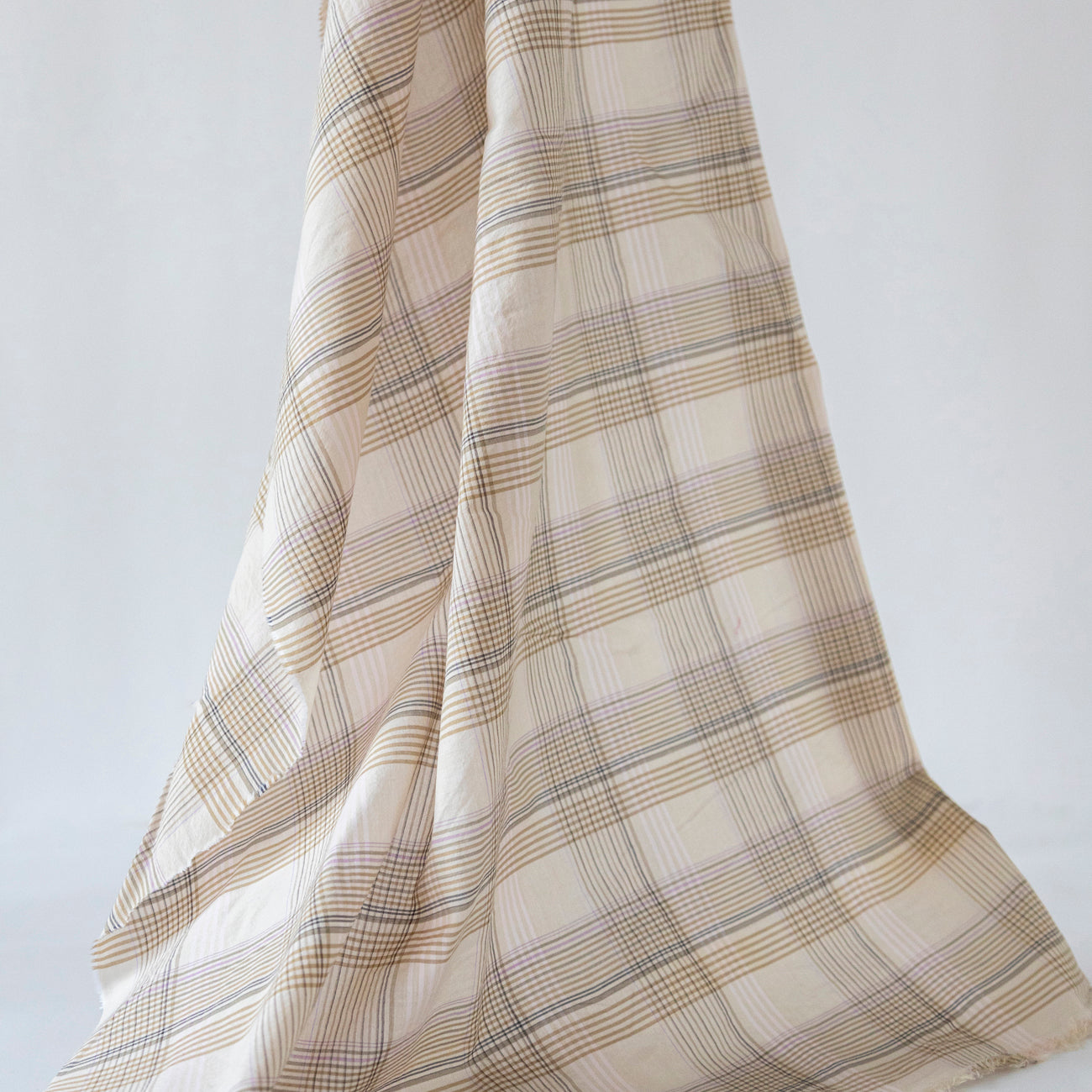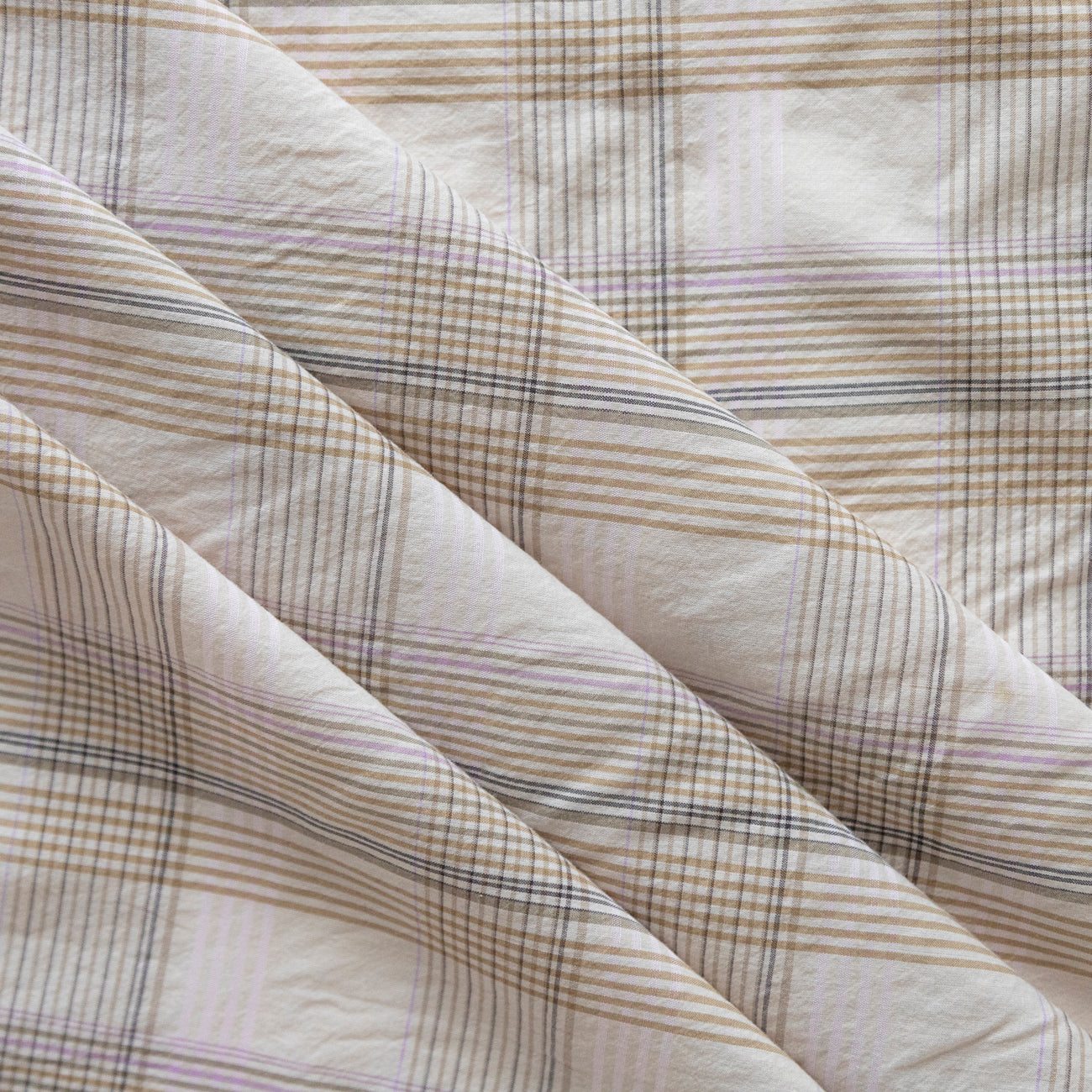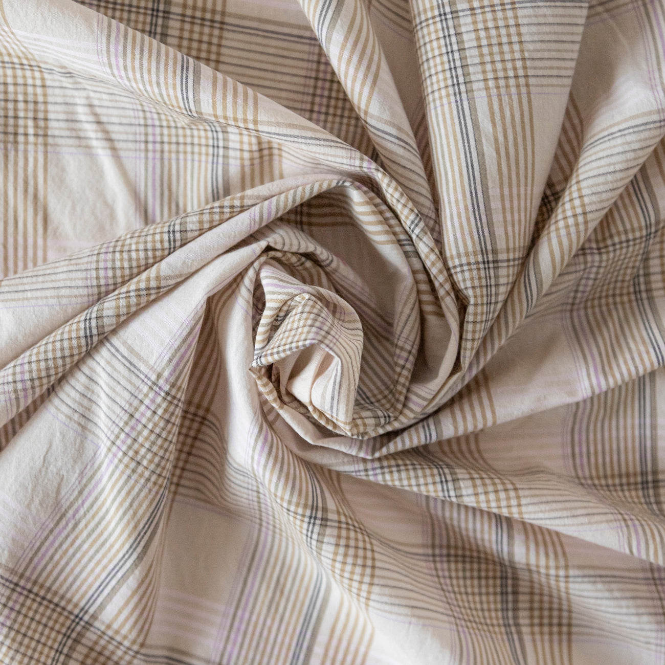 Tesătura din bumbac bej în carouri este plăcută la atingere, lasă pielea să respire și absoarbe umezeala. Materialul nu are elasticitate, dar oferă confort și rezistență, păstrându-și aspectul timp îndelungat fără a se scămoșa. Densitatea sa asigură durabilitate și o bună ținută a articolelor realizate din el.