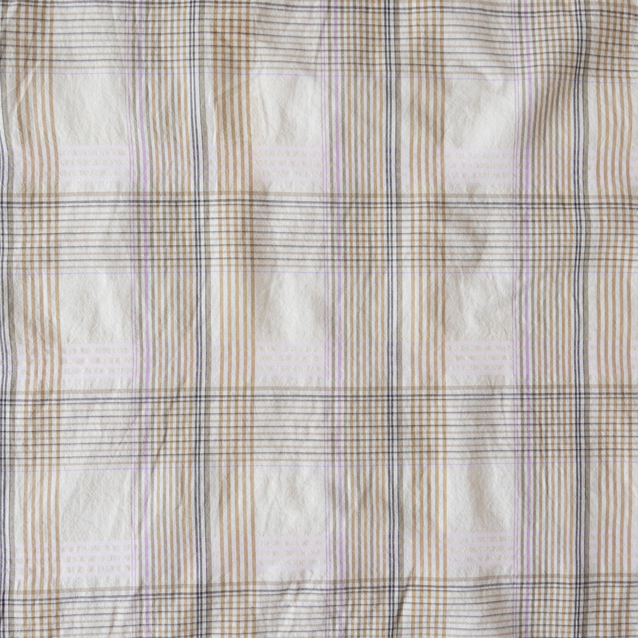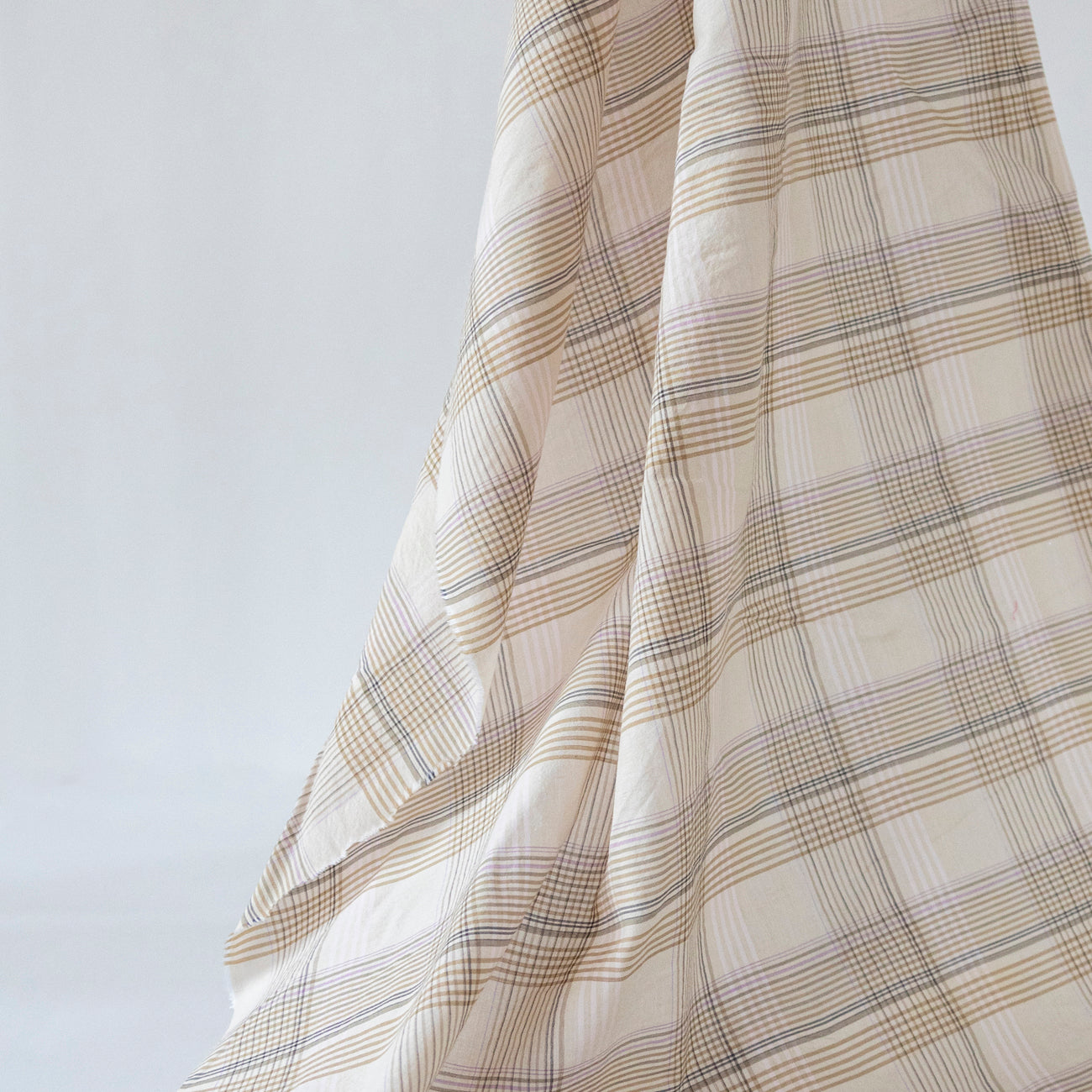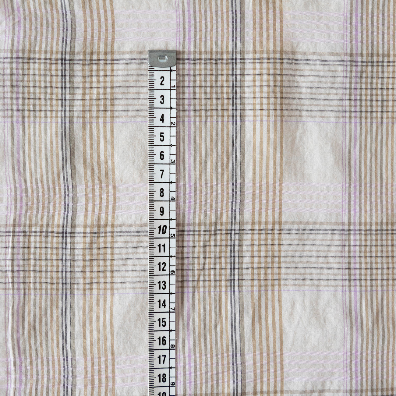Tesătura din bumbac bej în carouri este plăcută la atingere, lasă pielea să respire și absoarbe umezeala. Materialul nu are elasticitate, dar oferă confort și rezistență, păstrându-și aspectul timp îndelungat fără a se scămoșa. Densitatea sa asigură durabilitate și o bună ținută a articolelor realizate din el.