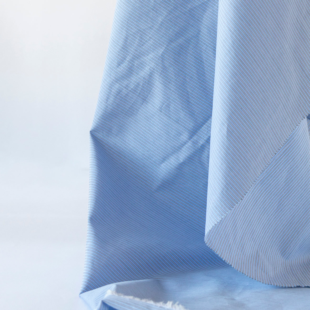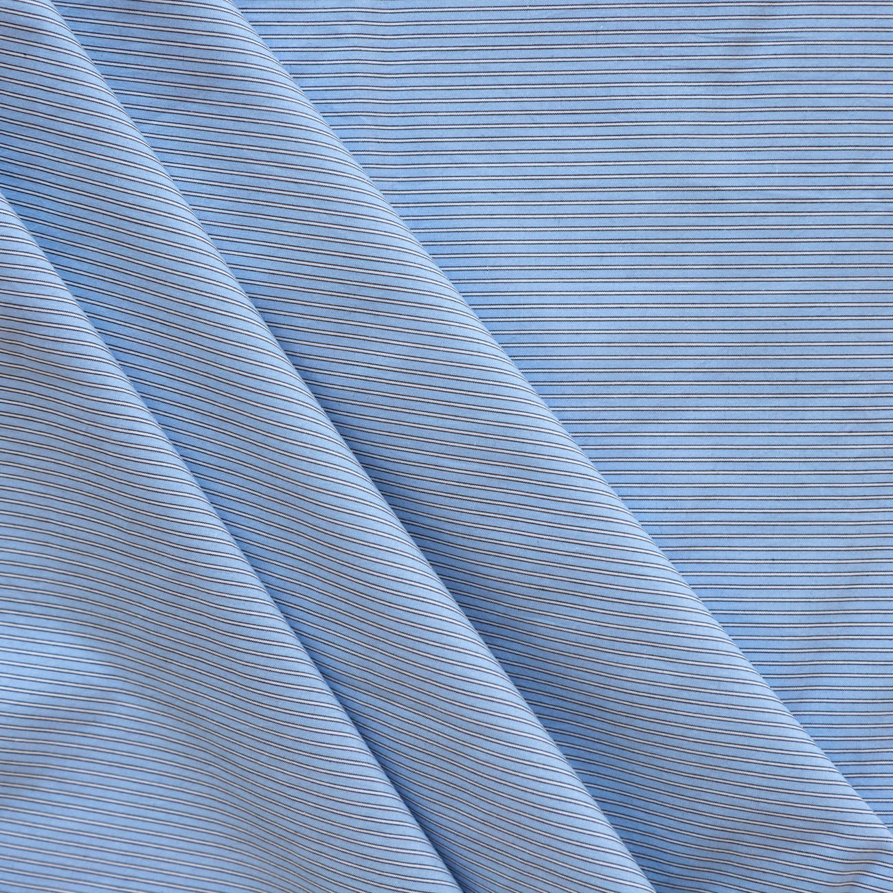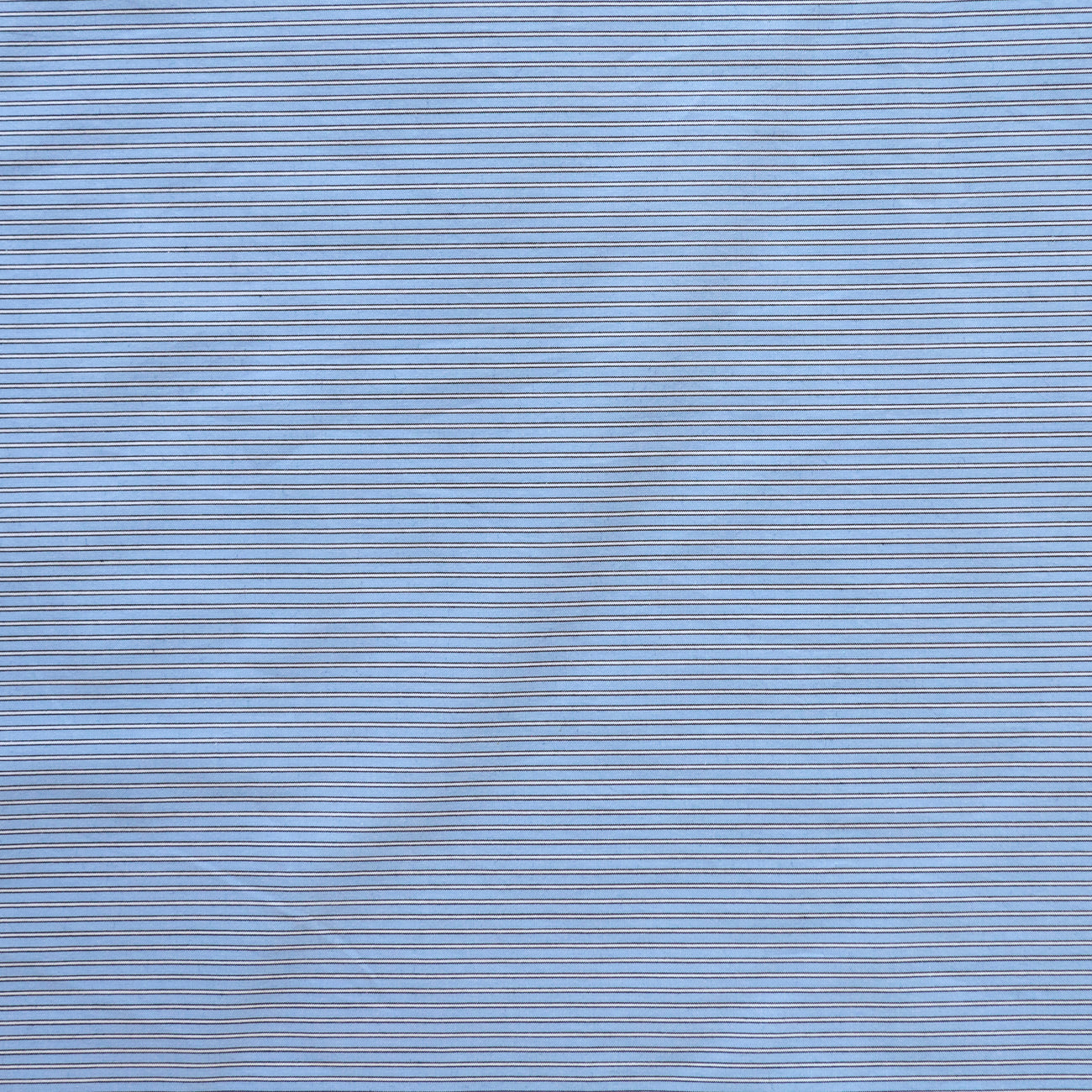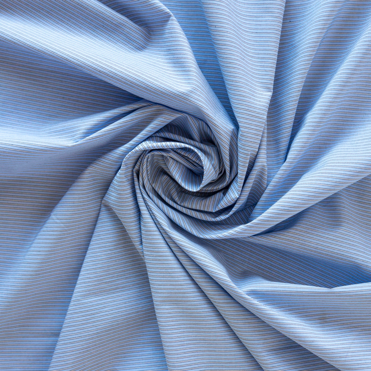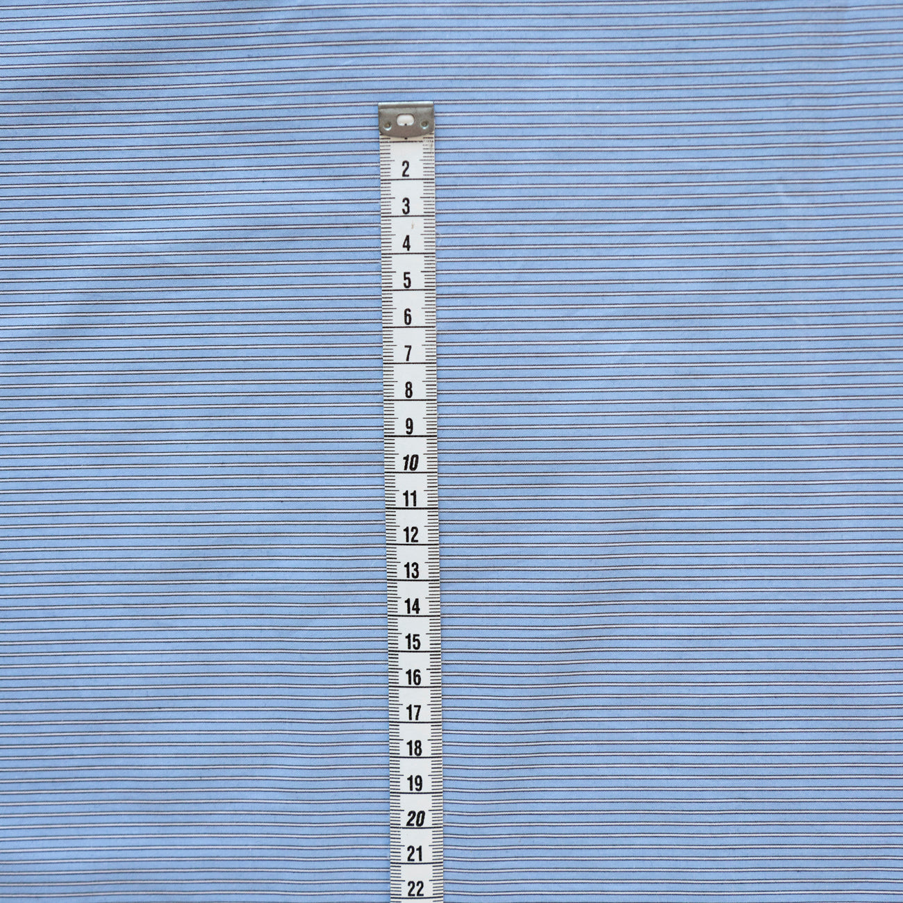 Tesătura din bumbac bleu cu dungi este un material fără elasticitate, realizat dintr-un amestec de bumbac și fibre sintetice, ceea ce îi conferă rezistență și o bună durabilitate în timp. Țesătura este plăcută la atingere, permite pielii să respire și absoarbe umezeala, asigurând un confort sporit pe durata purtării.