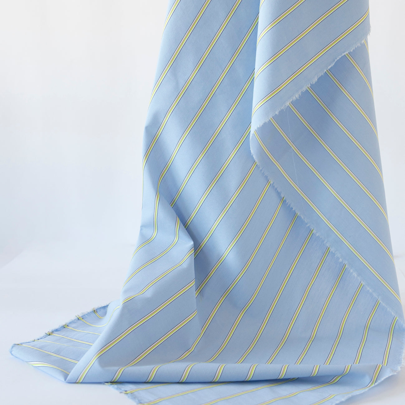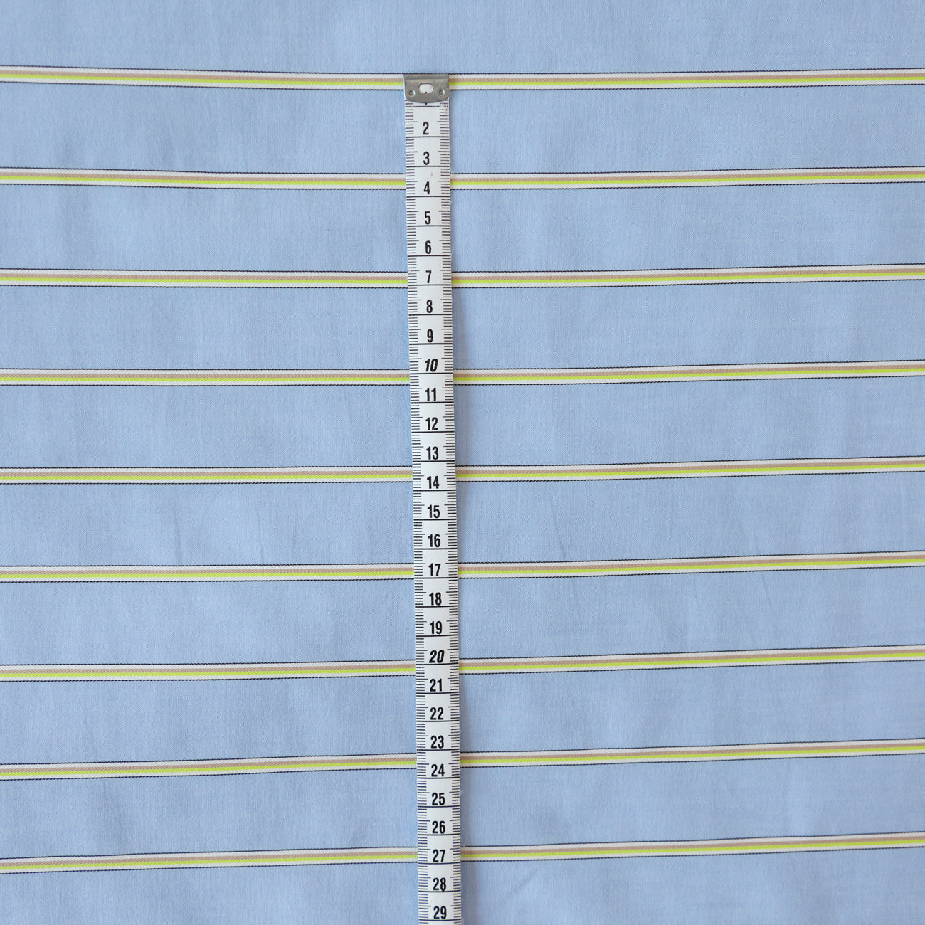 Tesătura din bumbac bleu cu dungi galbene este moale, plăcută la atingere și permite pielii să respire. Materialul absoarbe umezeala și oferă un confort sporit în purtare. Articolele confecționate din acest material sunt comode și își păstrează aspectul în timp, fără să se scamoșeze.