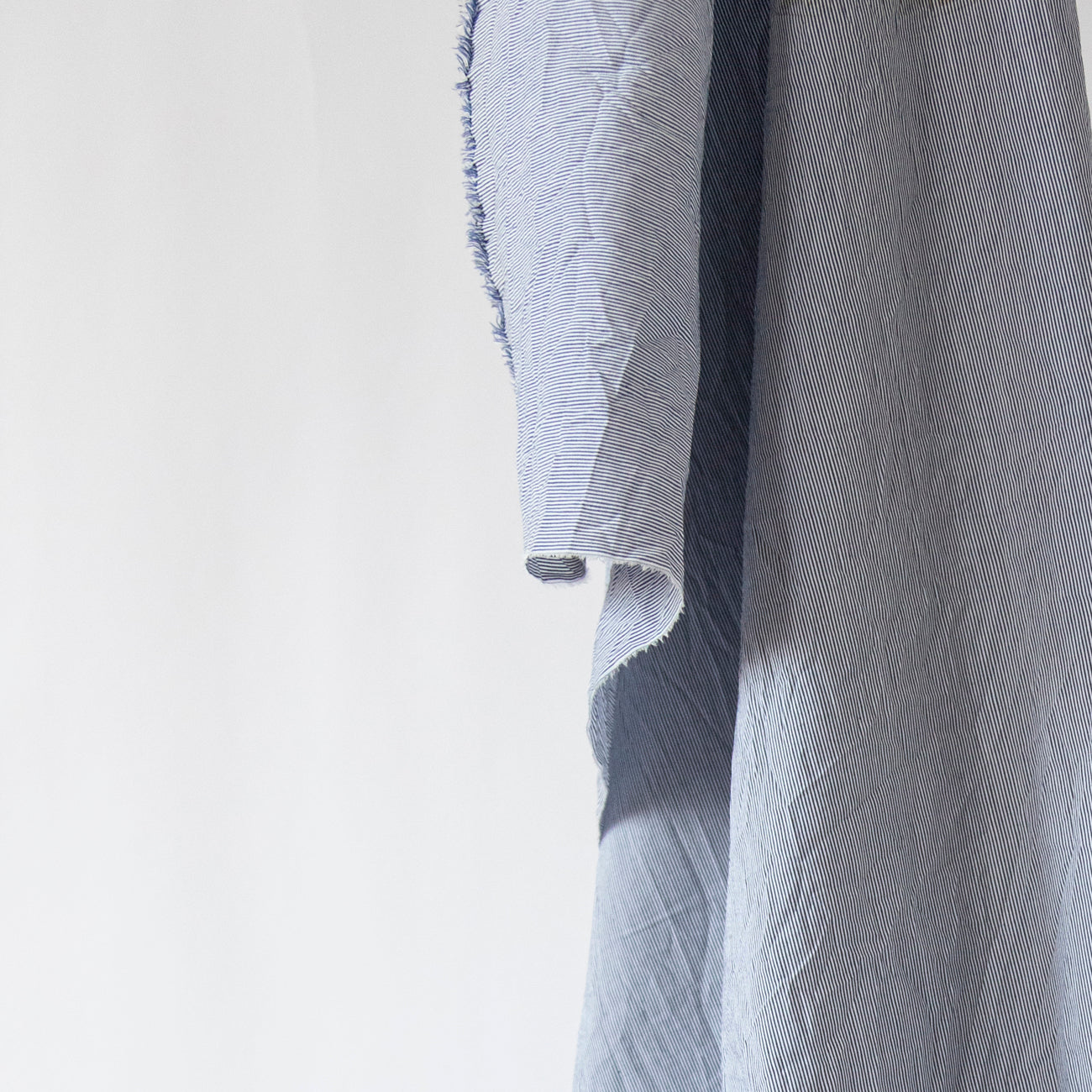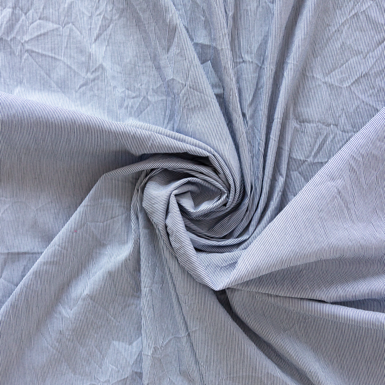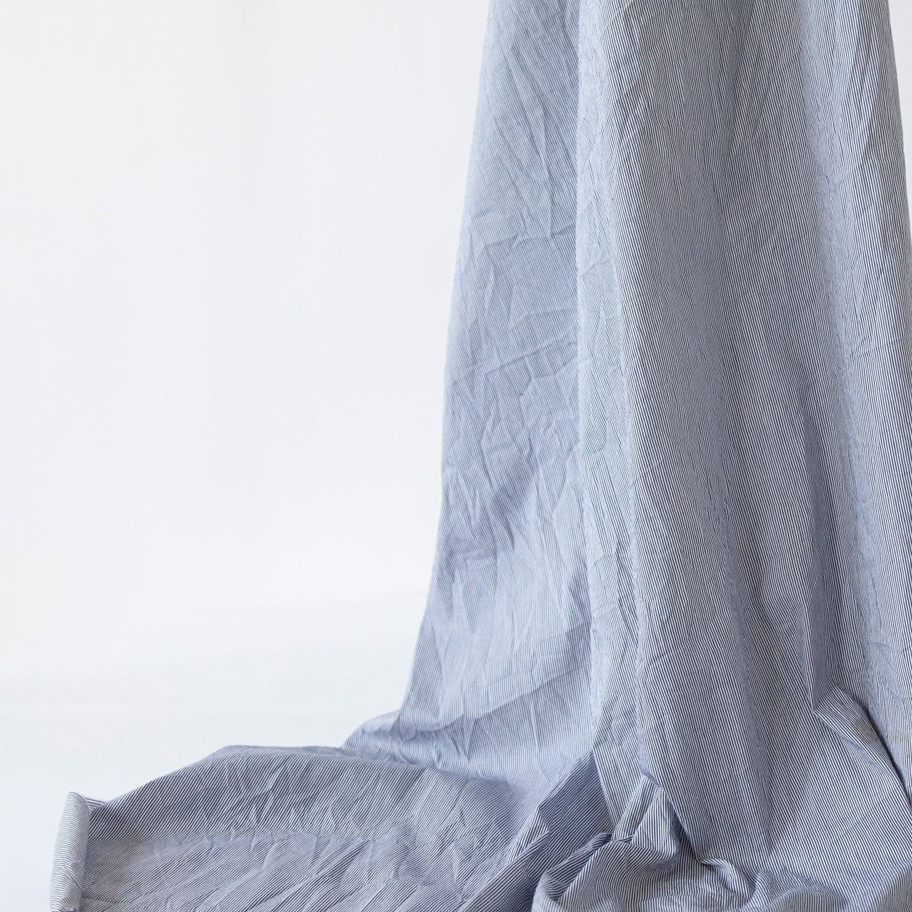 Bumbacul creponat cu dungi albastre este un material ușor elastic, plăcut la atingere și confortabil la purtare. Țesătura este realizată dintr-un amestec de bumbac și fibre sintetice, combinând avantajele naturale ale bumbacului cu rezistența suplimentară a materialului sintetic. Culoarea de bază este un off-white delicat, evidențiat de dungi albastre fine, care oferă un aspect modern și versatil.