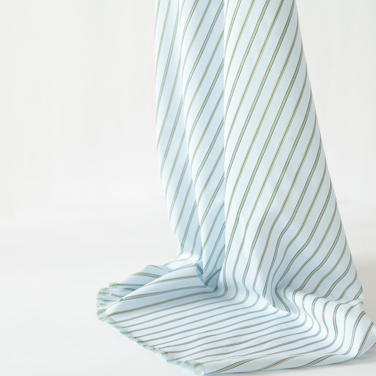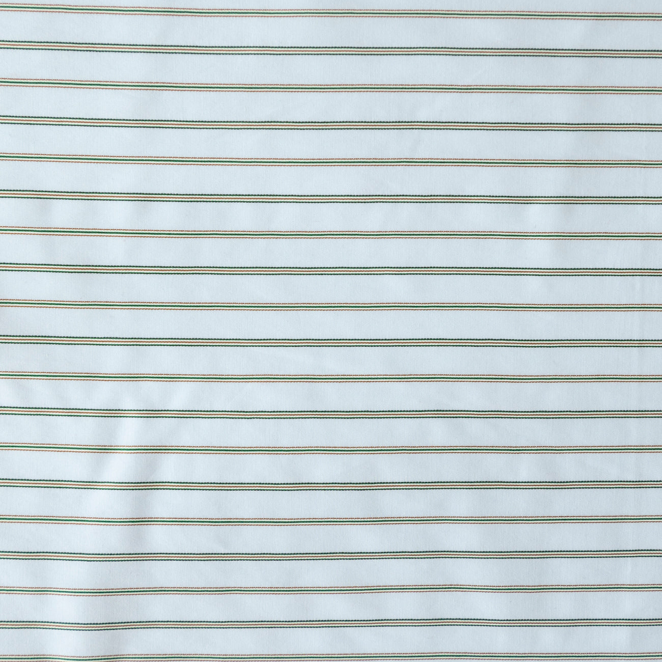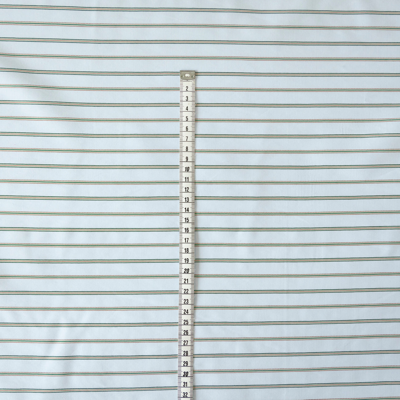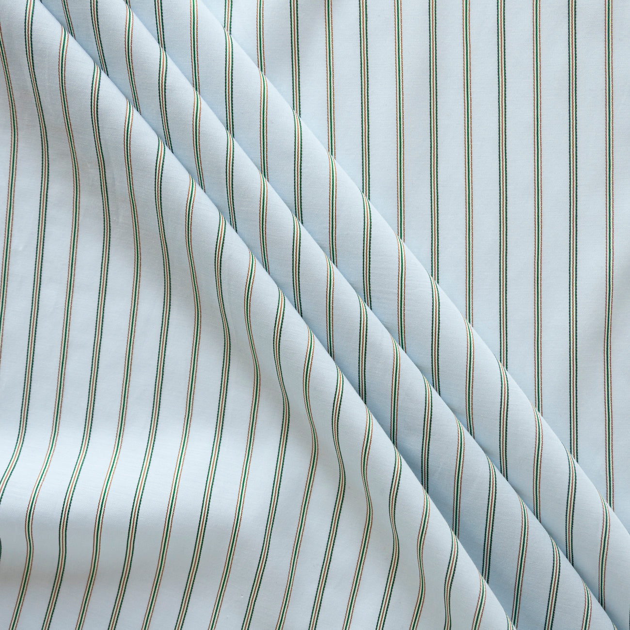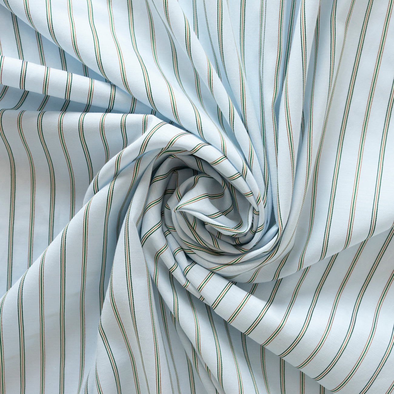 Tesătura din bumbac cu dungi multicolore este un material fără elasticitate, cu o compoziție de bumbac și fibre sintetice, ce oferă rezistență și durabilitate. Culoarea de bază este alb murdar, decorată cu dungi în nuanțe de verde și maro, ce adaugă un aspect plăcut și modern.