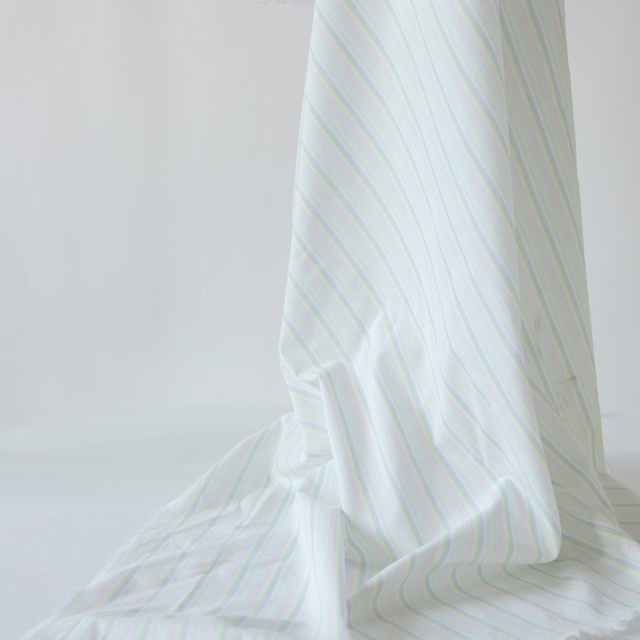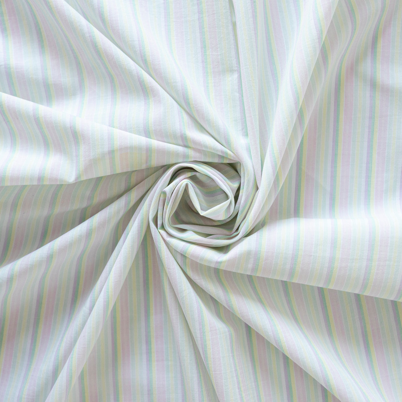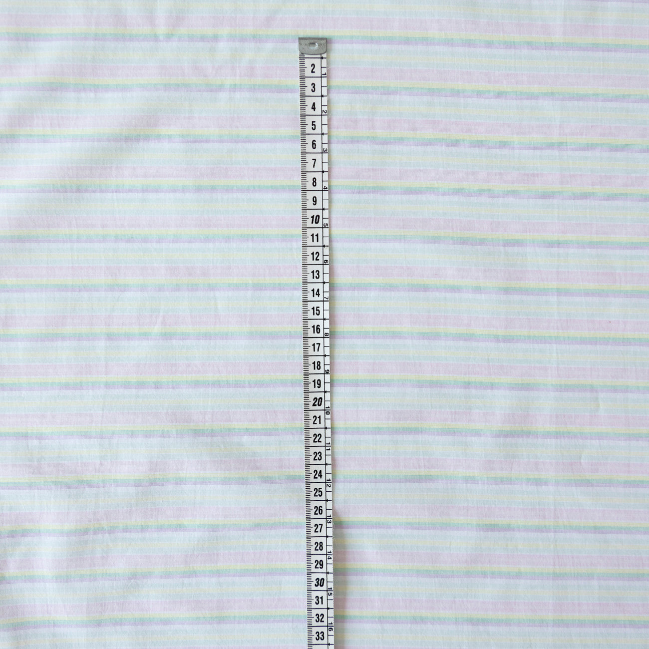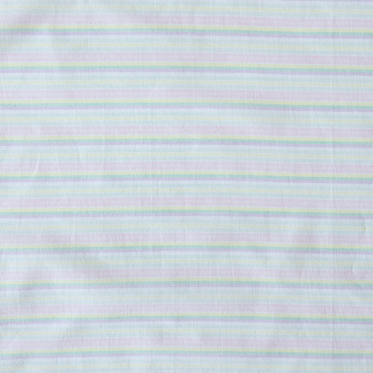 Tesătura din bumbac cu dungi multicolore este un material moale și plăcut la atingere, fără elasticitate, ce lasă pielea să respire și absoarbe umezeala. Este ușor de purtat, comod și confortabil, menținându-și aspectul în timp și fără a se scămoșa. Densitatea materialului îi conferă rezistență și durabilitate, făcându-l ideal pentru piese vestimentare practice și de lungă durată.