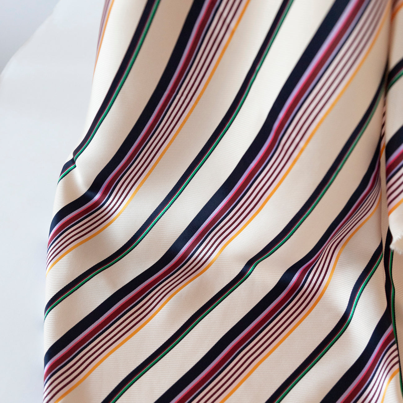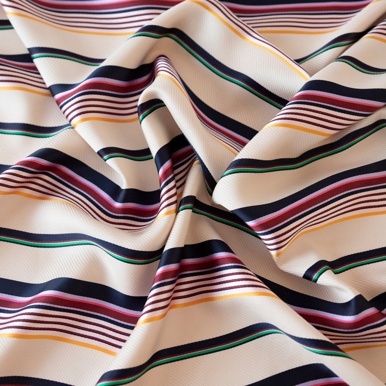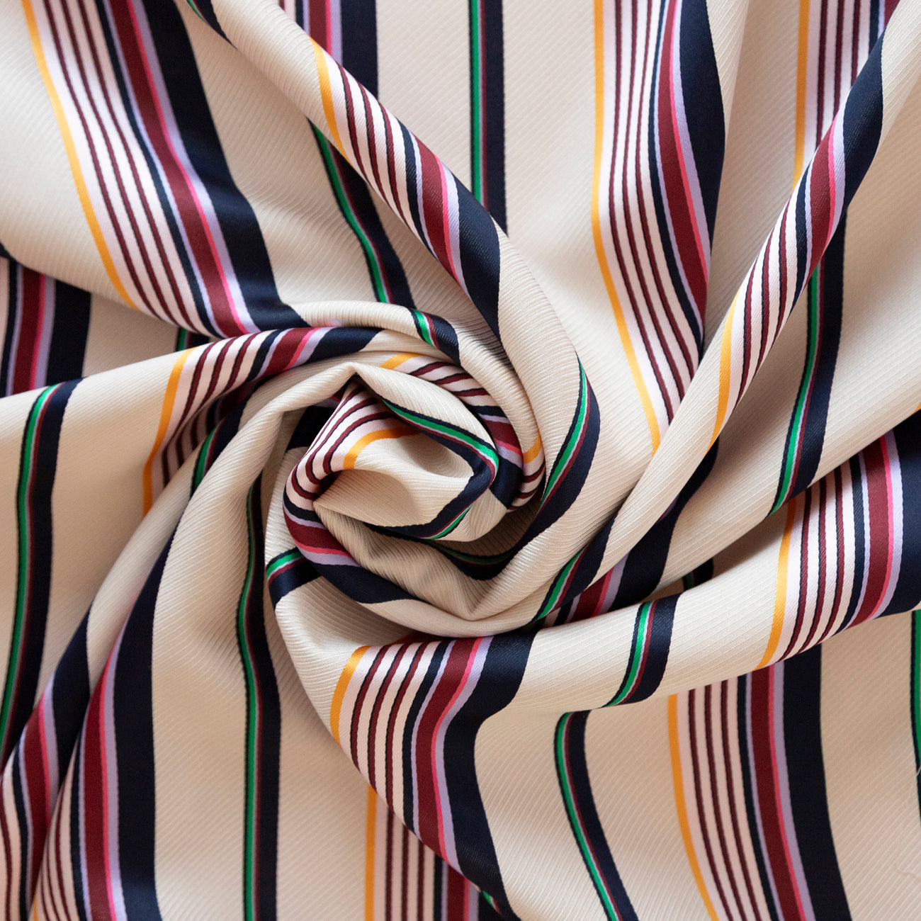 Material fin, elegant și fără elasticitate, ideal pentru creații rafinate. Compoziția sa, un amestec de mătase și țesătură sintetică, îi conferă atât un aspect lucios, cât și rezistență sporită în timp. Designul cu dungi multicolore pe fundal bej adaugă un plus de stil și versatilitate, potrivit atât pentru ținute casual, cât și elegante.
