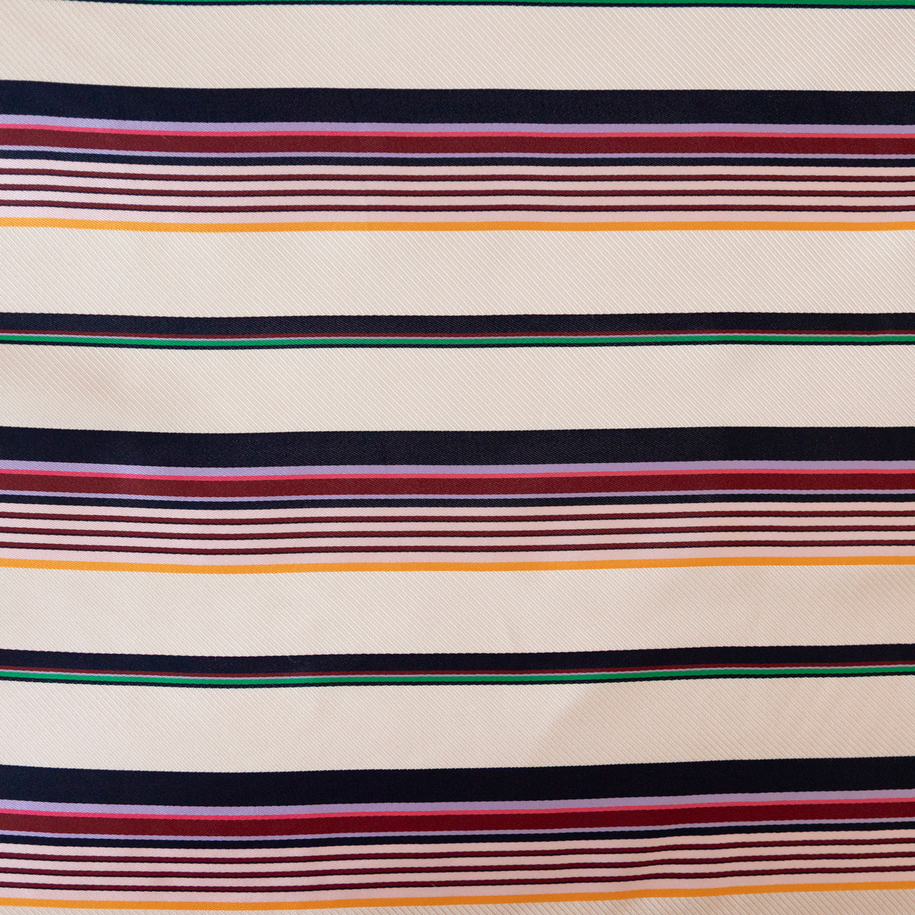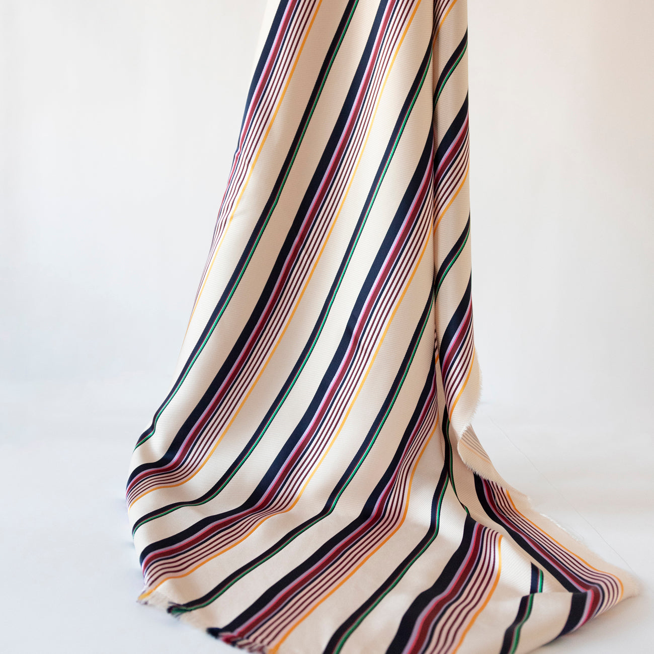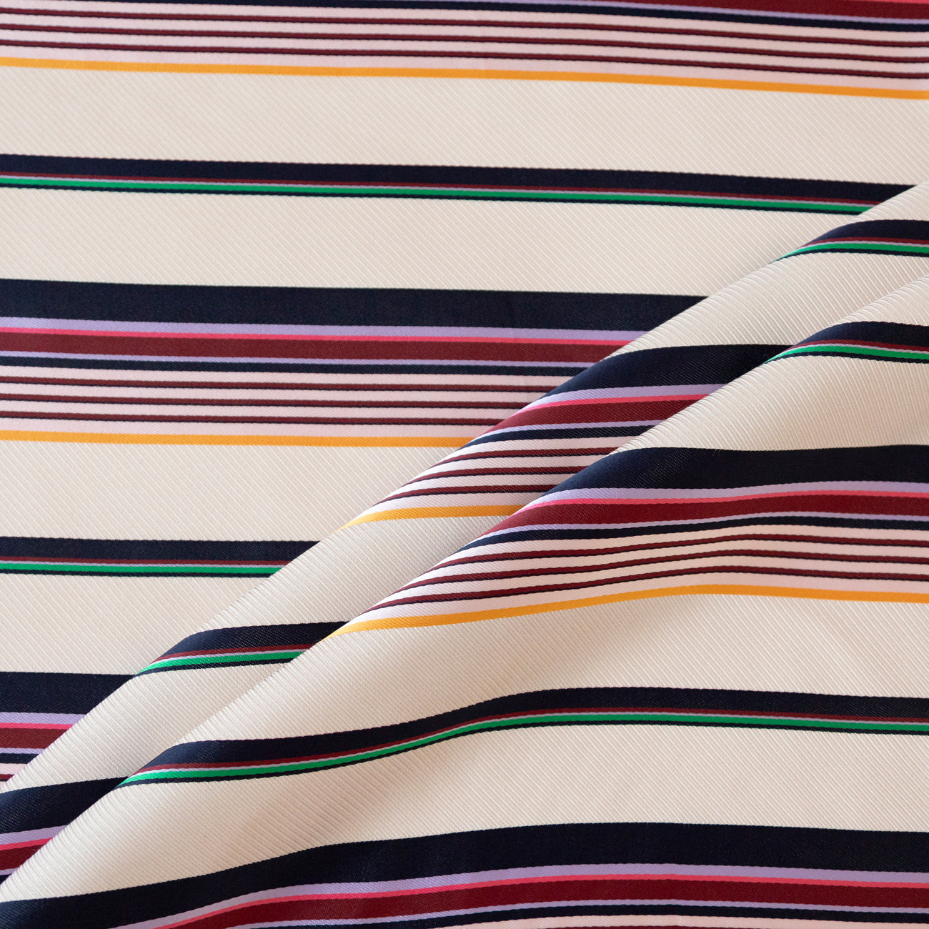 Material fin, elegant și fără elasticitate, ideal pentru creații rafinate. Compoziția sa, un amestec de mătase și țesătură sintetică, îi conferă atât un aspect lucios, cât și rezistență sporită în timp. Designul cu dungi multicolore pe fundal bej adaugă un plus de stil și versatilitate, potrivit atât pentru ținute casual, cât și elegante.