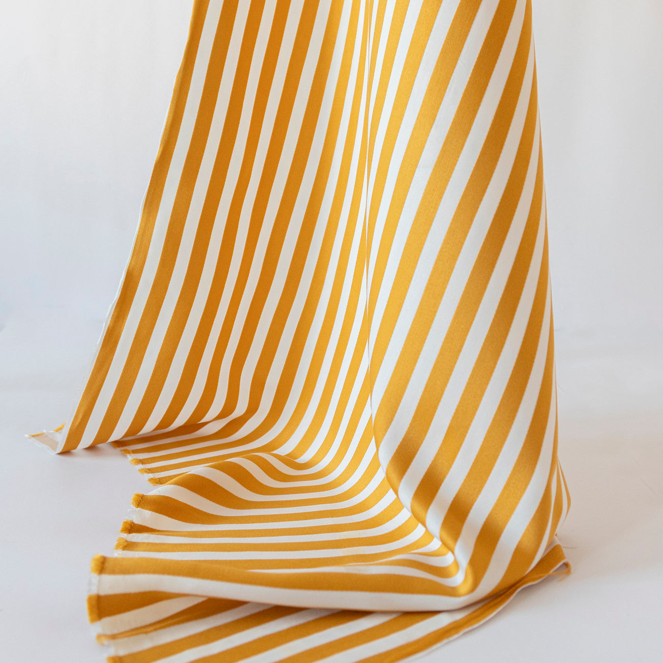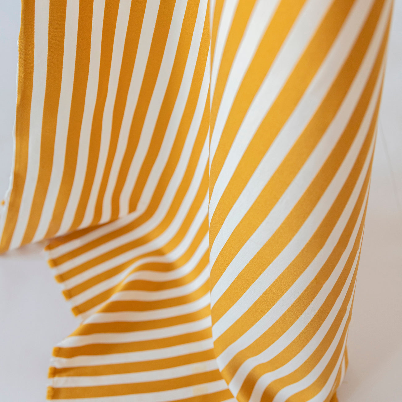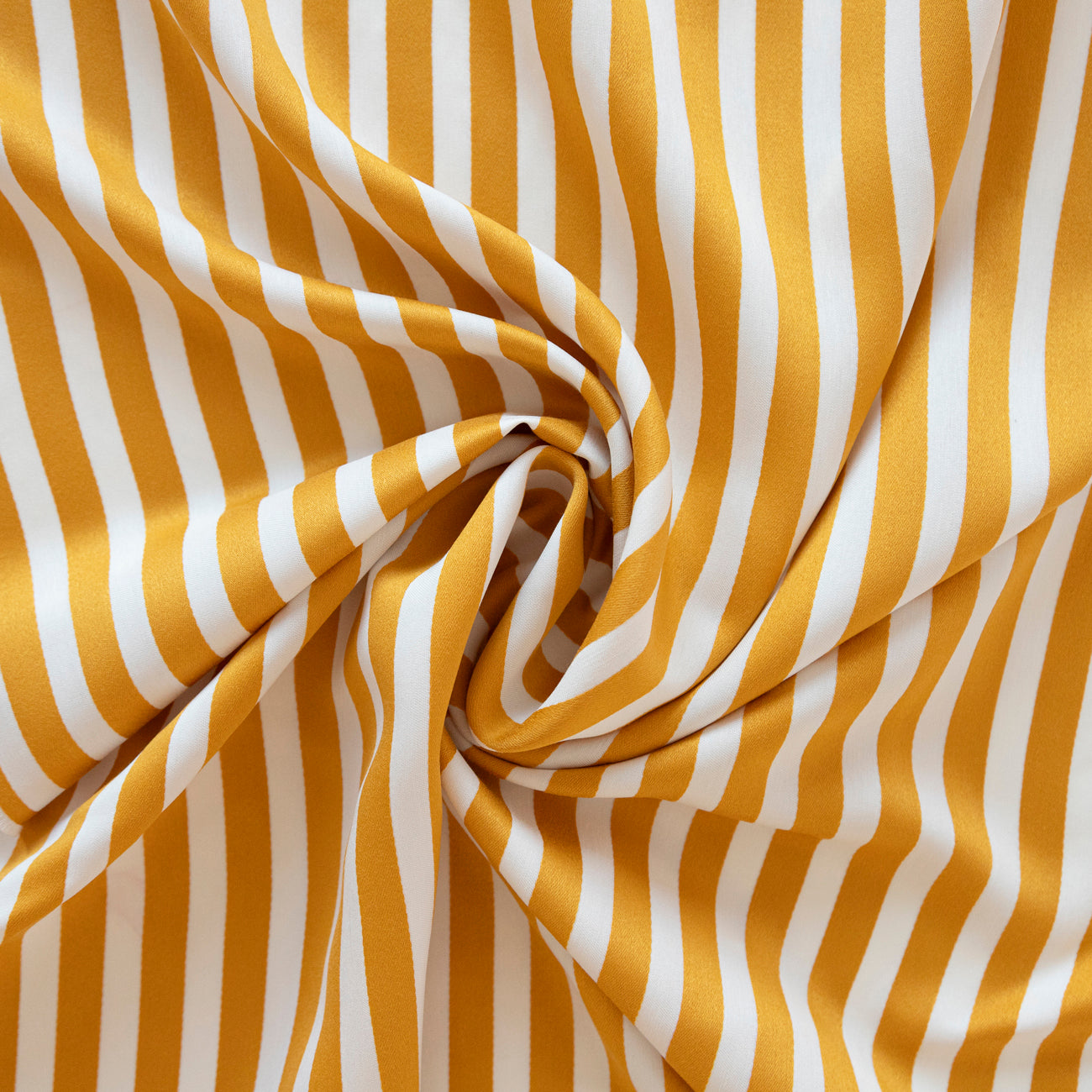 Tesătură elegantă și rafinată, cu o textură fină și un aspect strălucitor. Materialul nu are elasticitate, fiind realizat dintr-un amestec de mătase și fibre sintetice, ceea ce îi conferă rezistență și o cădere frumoasă. Combinația de alb imaculat și dungi aurii discrete adaugă un plus de sofisticare, transformând orice piesă vestimentară într-un articol deosebit.