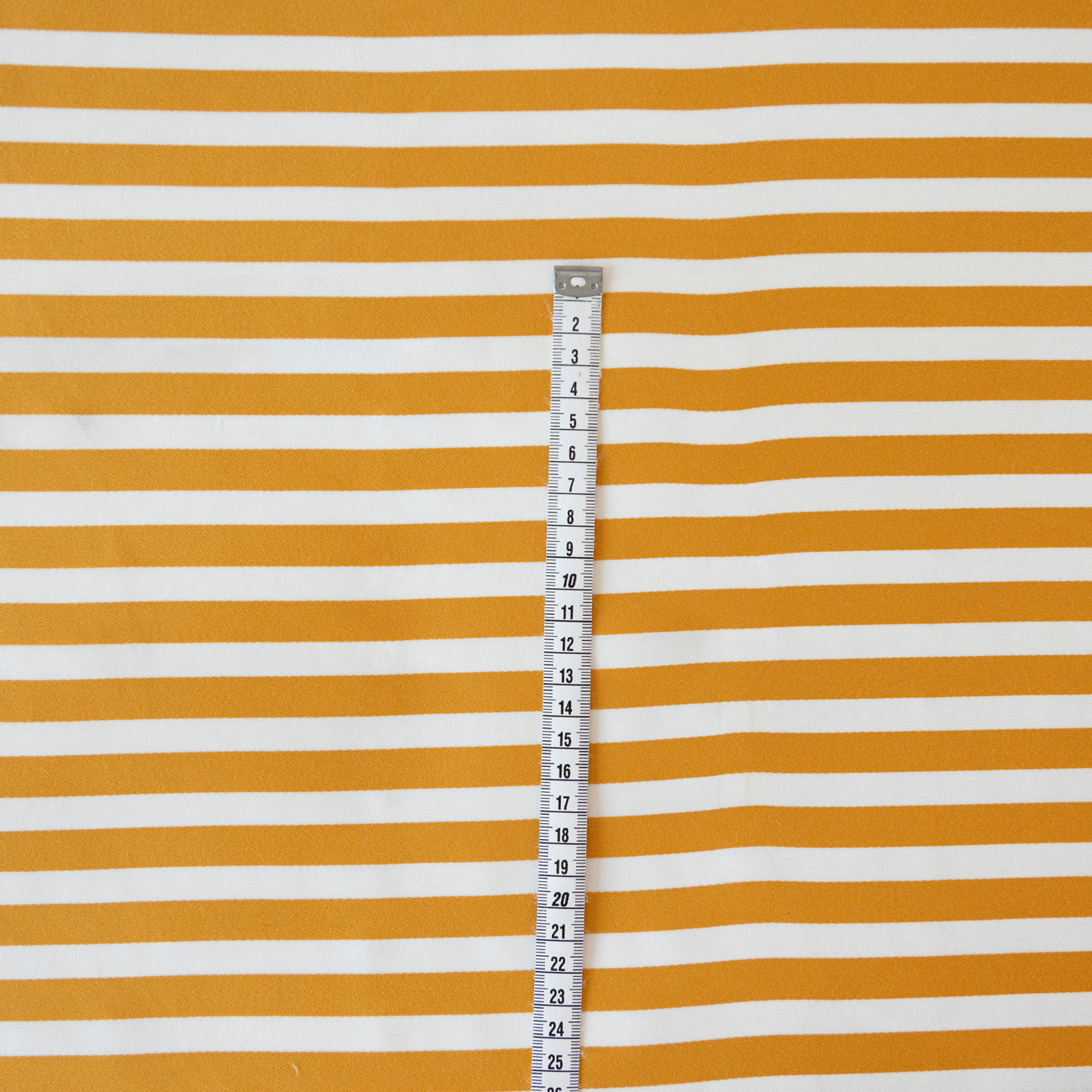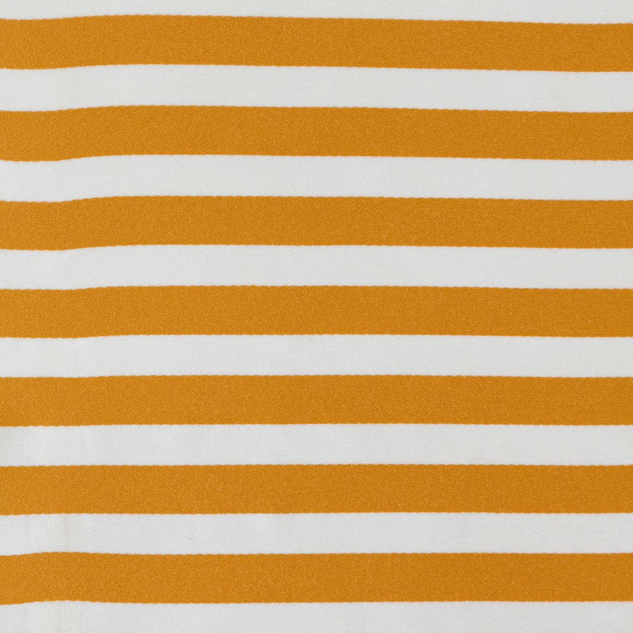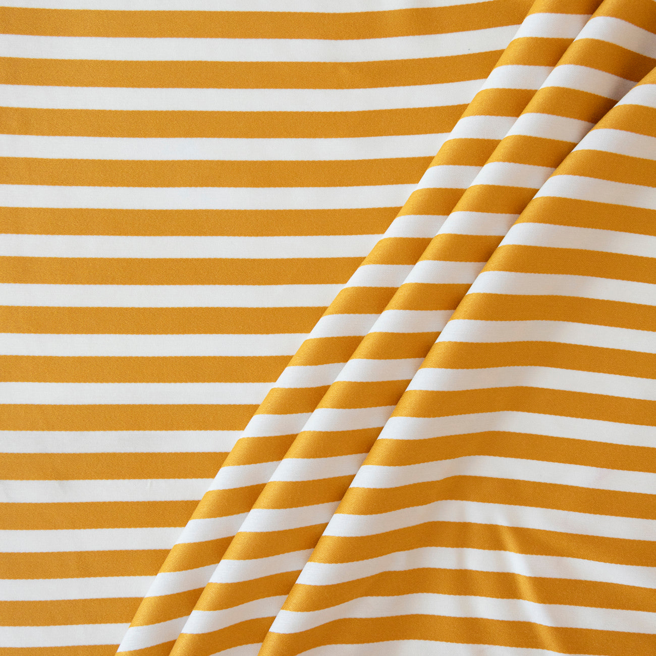 Tesătură elegantă și rafinată, cu o textură fină și un aspect strălucitor. Materialul nu are elasticitate, fiind realizat dintr-un amestec de mătase și fibre sintetice, ceea ce îi conferă rezistență și o cădere frumoasă. Combinația de alb imaculat și dungi aurii discrete adaugă un plus de sofisticare, transformând orice piesă vestimentară într-un articol deosebit.